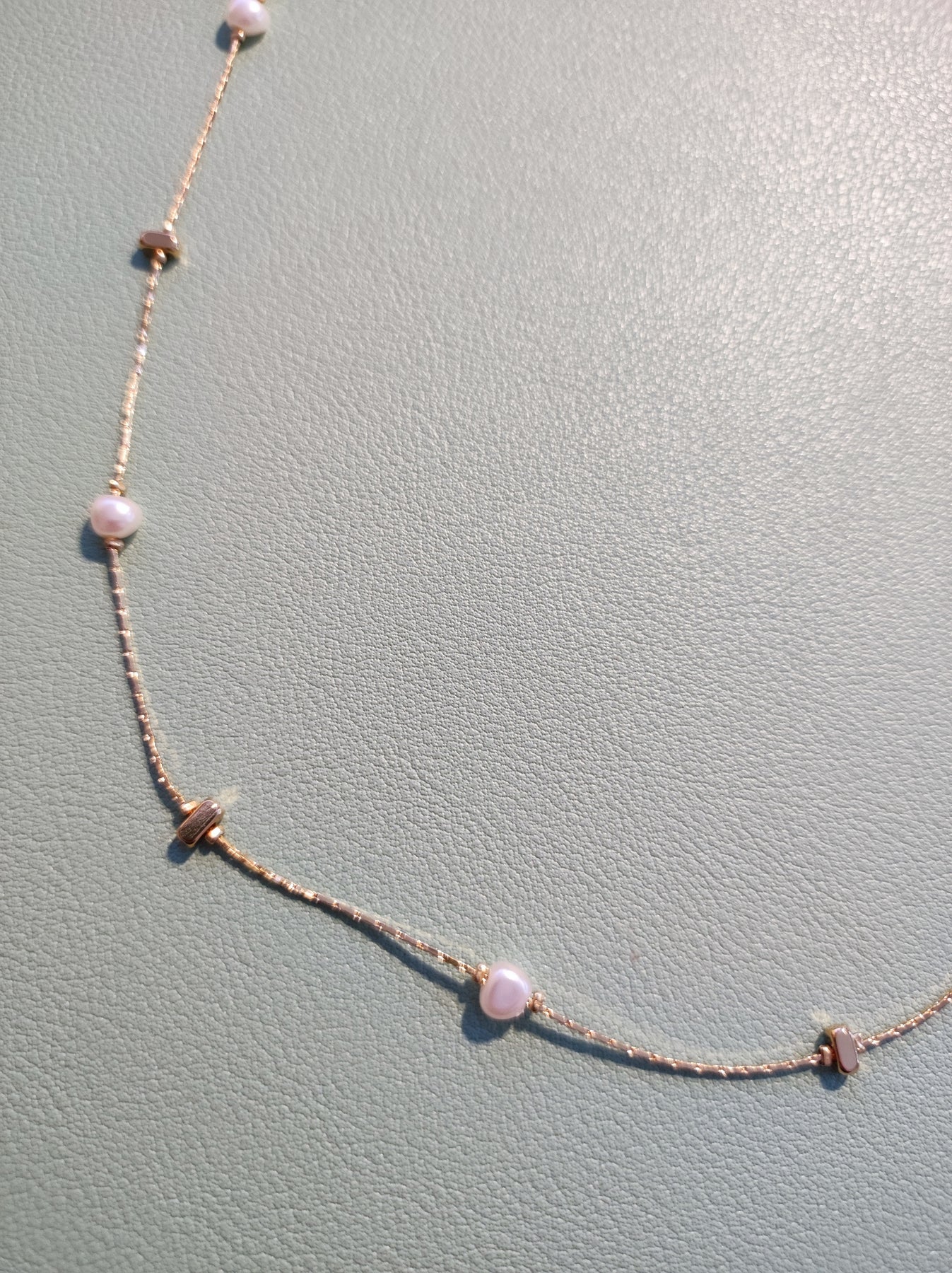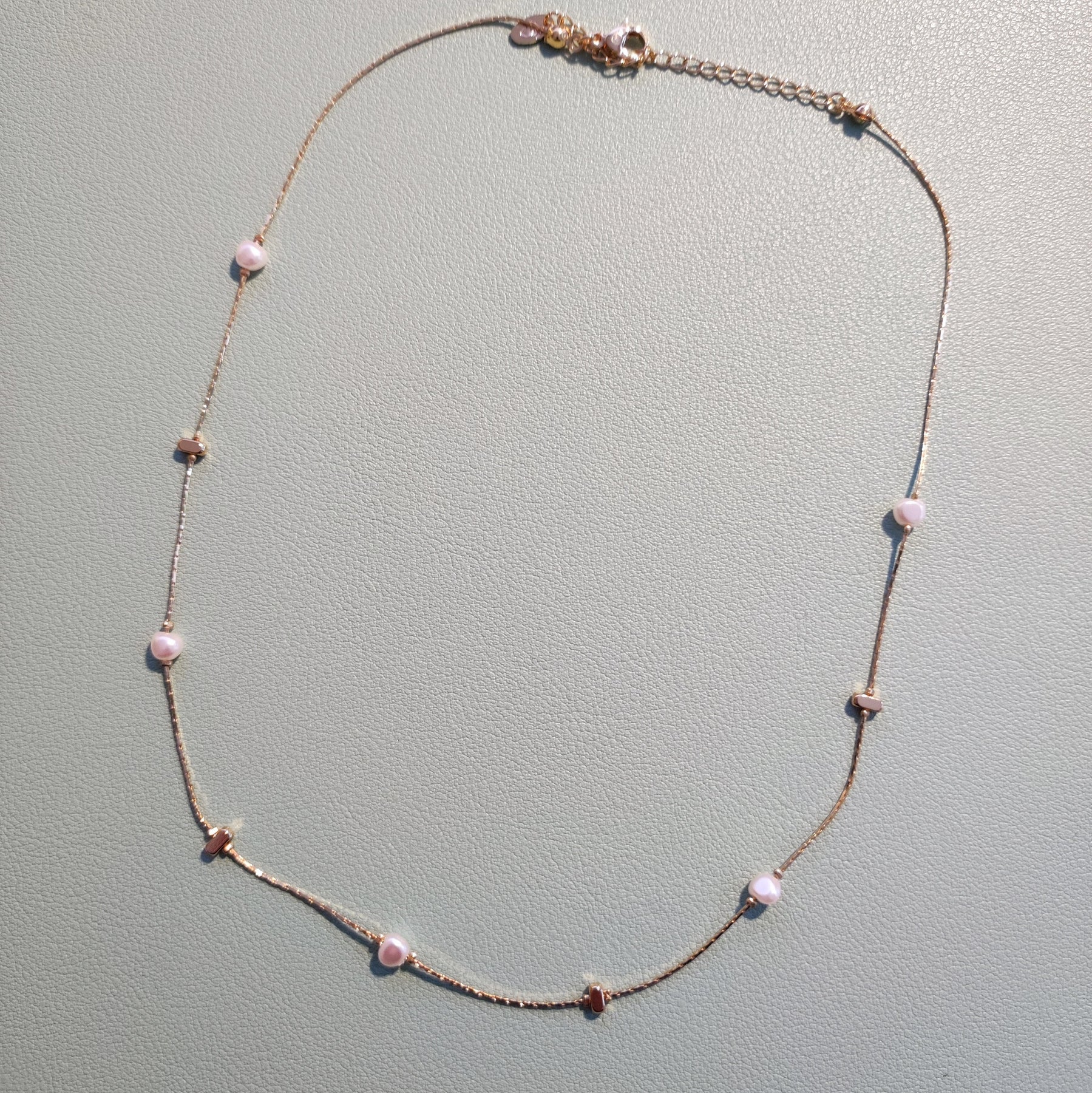 Modeschmuck - vergoldetes Edelstahl, feines Kettchen mit 5 Perlen und 4 goldenen Stäbchen Elementen im festen Abstand