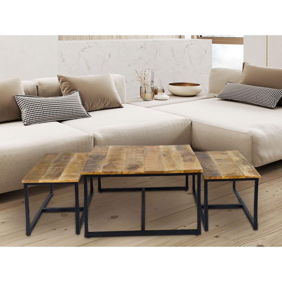 Das Couchtisch-Set Ontario zeichnet sich durch seine vielfältige Nutzung aus. Es kann als Beistelltisch einzeln oder auch in Kombination als Couchtisch genutzt werden. Durch seine 3 Tische kann das Tisch-Set hervorragend variabel in jeder Wohnungseinrichtung aufgestellt werden und gibt Ihren Räumlichkeiten einen zeitgemäßen Look im Industrie-Design.