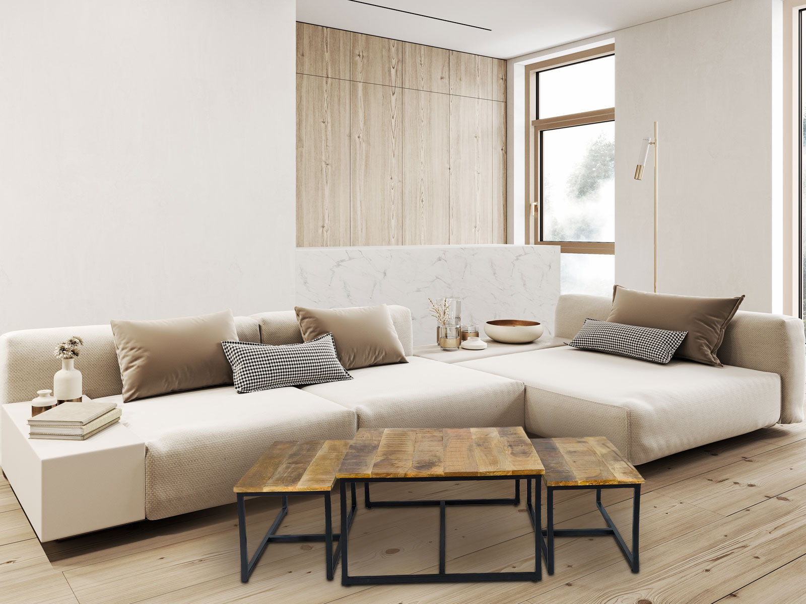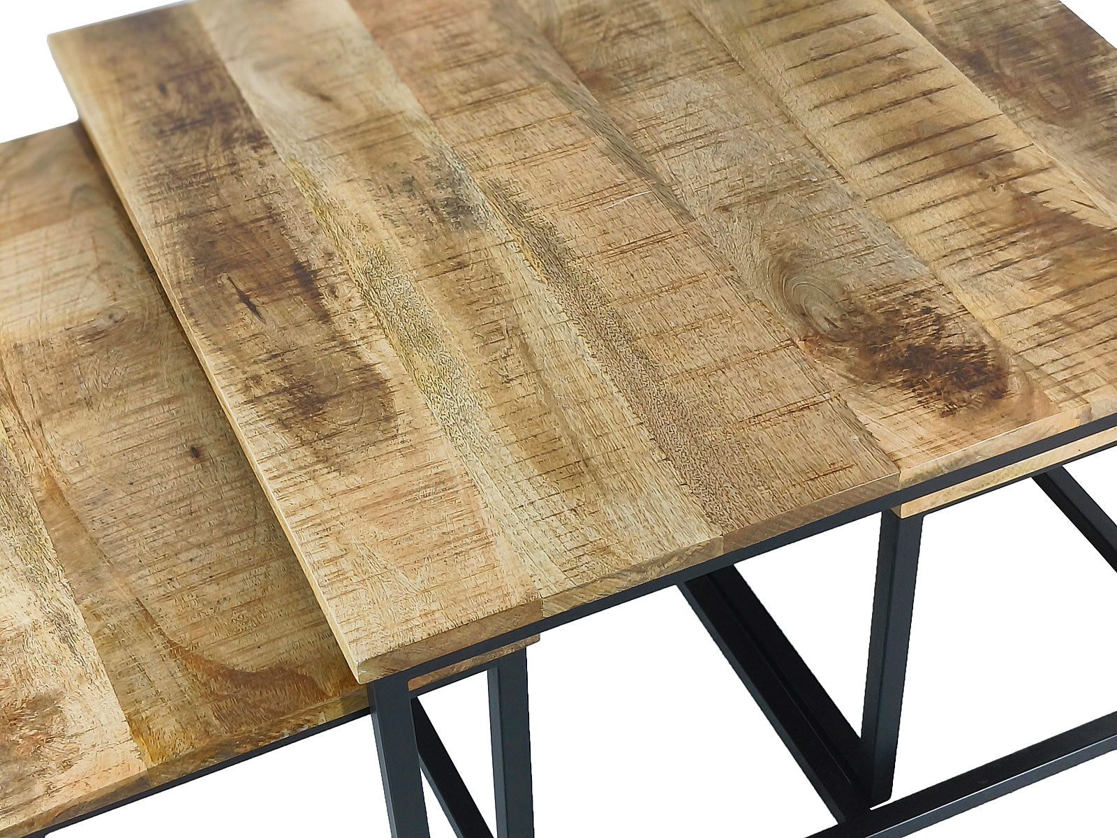 Couchtisch Massivholz quadratisch im 3er Set mit pulverbeschichtetem Metall-Gestell schwarz matt
