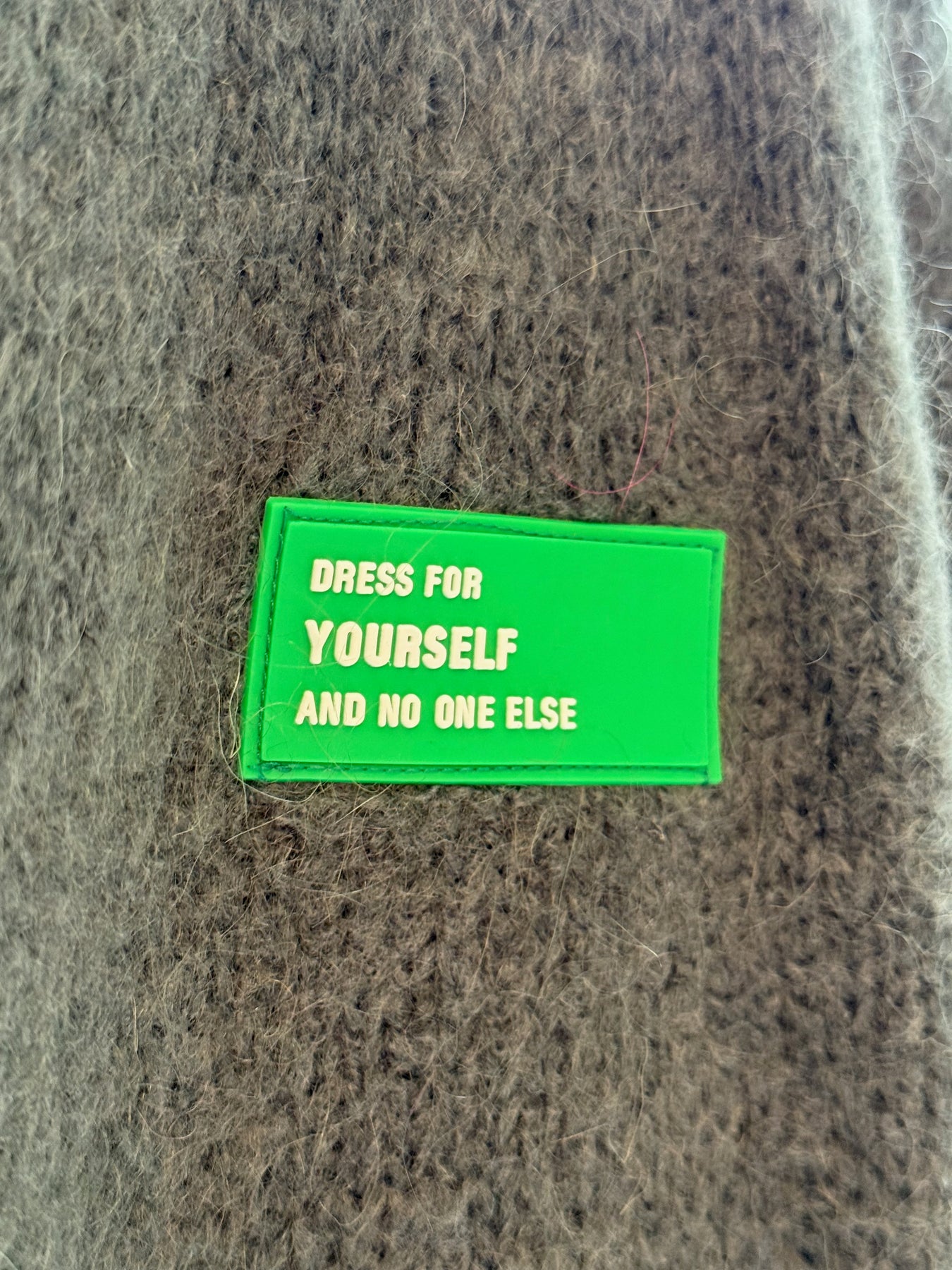 Der Cardigan ist mehr als nur ein Kleidungsstück – er ist ein Statement. In sanftem Oliv gehalten und mit einem leuchtenden Neon-Textfeld versehen, zieht er alle Blicke auf sich und verleiht deinem Outfit eine fröhliche, energiegeladene Note. Der weiche Mohair-Mix sorgt für ein angenehmes Tragegefühl, während der lockere Schnitt Bewegungsfreiheit bietet. Ob über einem schlichten Top oder als Highlight zu deinem Lieblingskleid – dieser Cardigan setzt Akzente und lässt dich strahlen. Perfekt für Tage, an denen du dich besonders fühlst und deine Persönlichkeit zeigen möchtest.