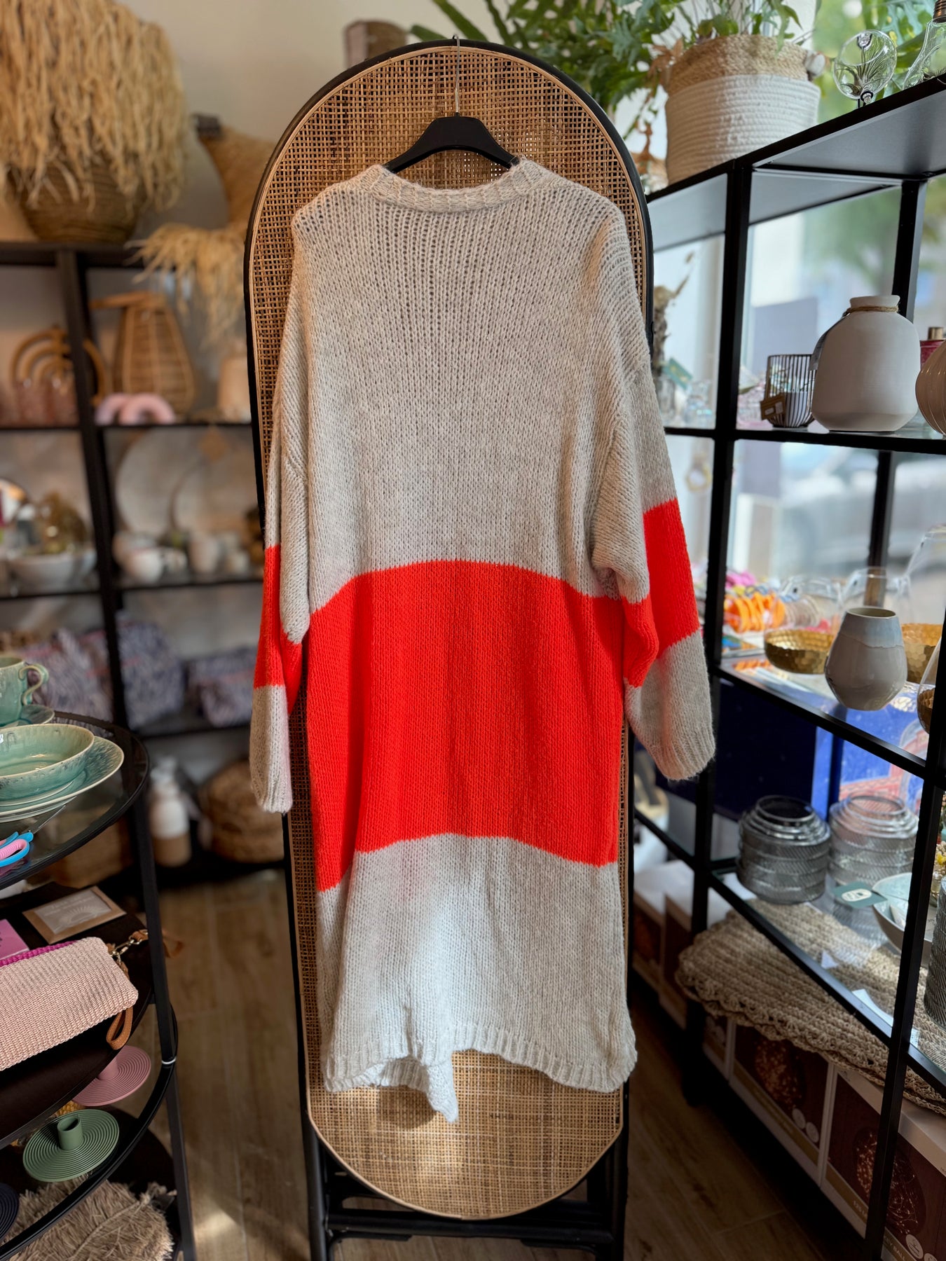 Cardigan Grau Neonorange, Langstrickjacke, Damen Cardigan, Boho Mode, Übergangsjacke, lockere Passform Jacke, Alltagsmode, Mode mit Gefühl