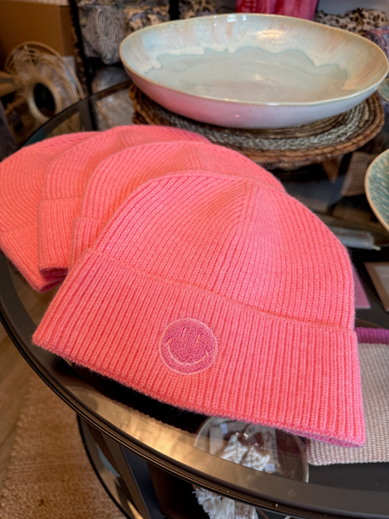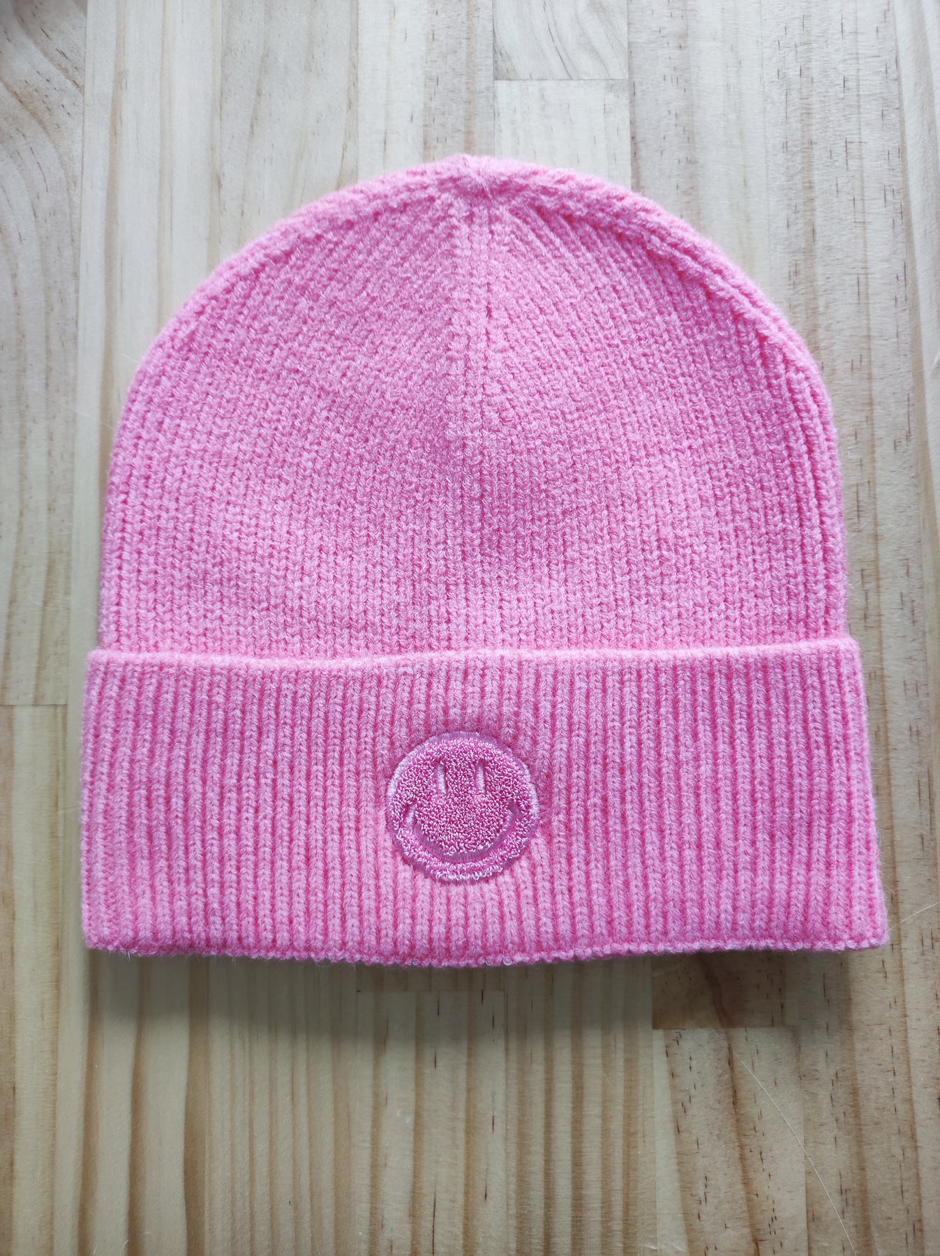 Beanie Smiley, rosa Mütze, Damen Beanie, Viskose Wolle Mix, One-Size Mütze, Smiley Patch, Made in Italy, Statement Beanie, Boho Mode, Streetstyle Mütze