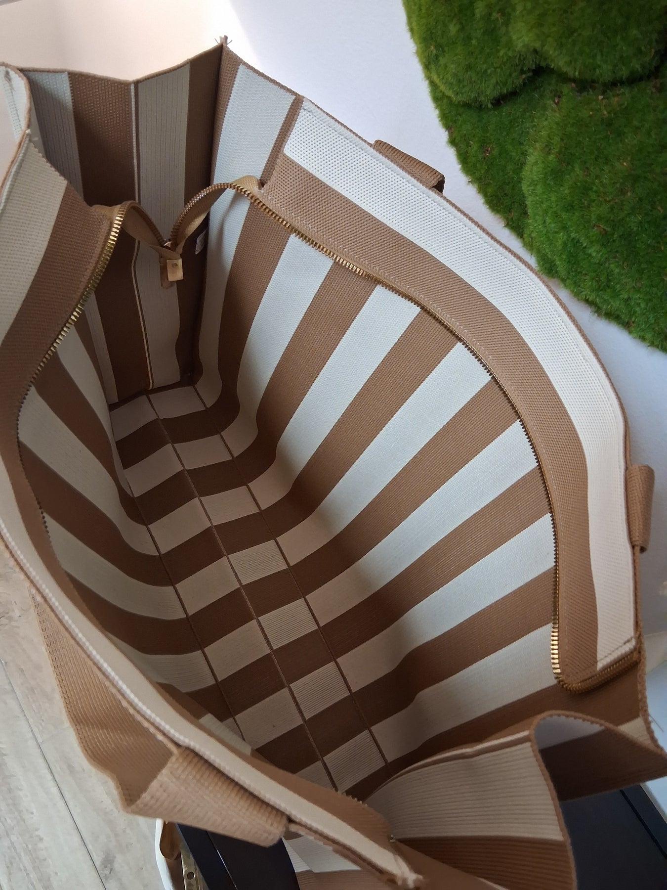 Das gestreifte Muster verbindet natürliche Farb­töne zu einem stilvollen, modernen Statement, das sich vielseitig kombinieren lässt. Diese Tasche ist nicht nur praktisch, sondern auch ein Ausdruck deiner Stimmung und Lebendigkeit.