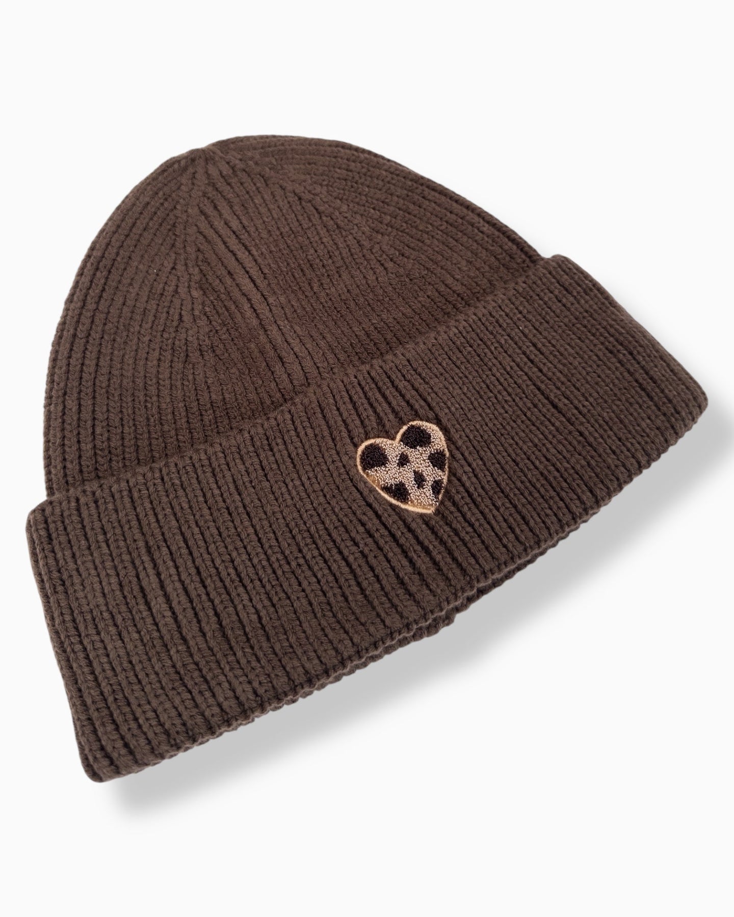 Beanie Leo Herz, Beanie braun Damen, Leo Herz Mütze, Strickmütze Herz Leo, Damen Beanie Leo Print, Mütze braun Leo Herz, Wintermütze Herzdetail, stylische Beanie Damen, Komfort Beanie Leo Herz, Accessoire Beanie Leo Herz