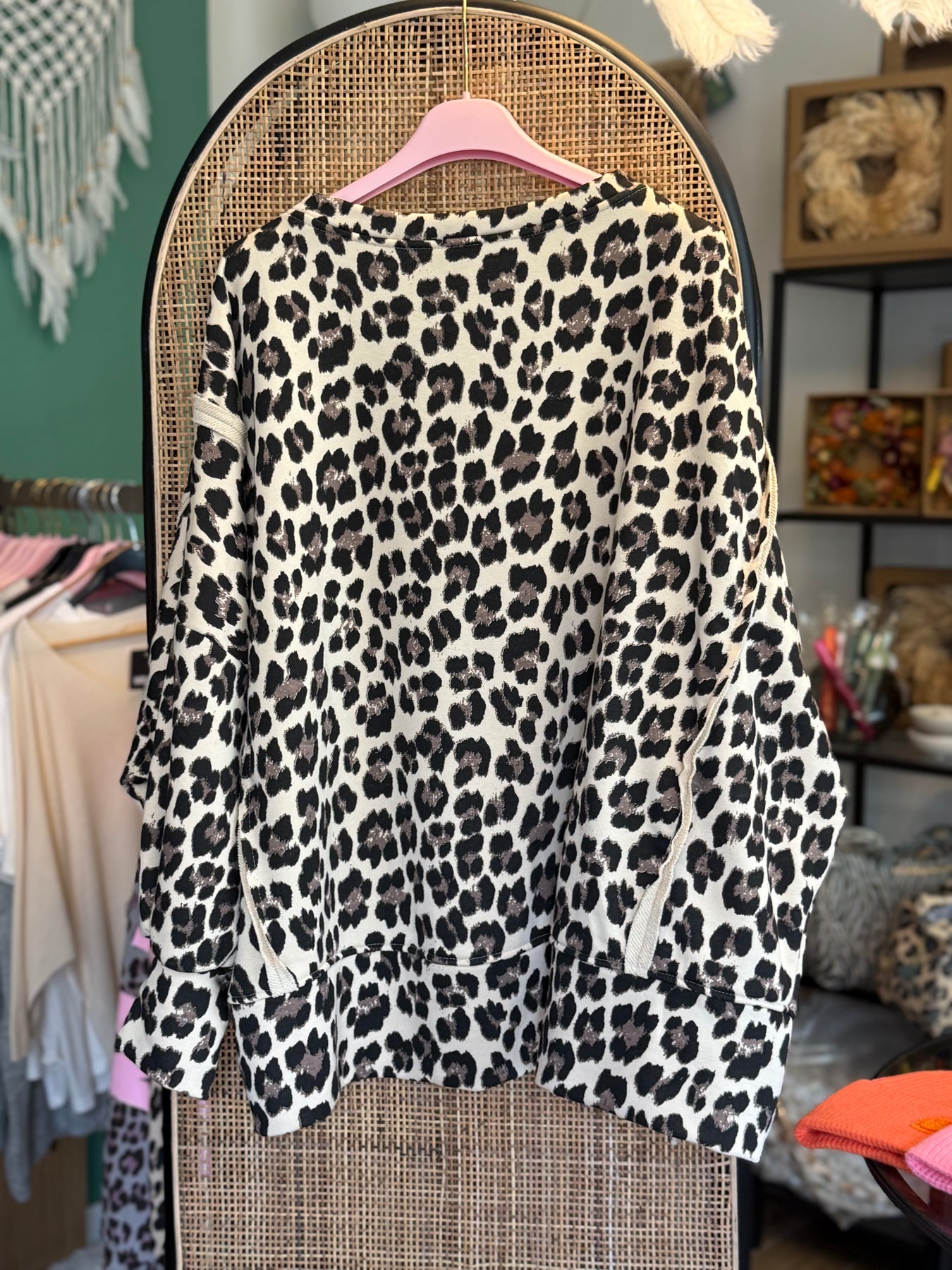 Pullover Leo, weites Schnittpullover Damen, auffällige Nähte Pullover, Leo-Print Pullover Damen, stylischer Pullover Nähten, Oversize Leo Pullover, Patchdetail Pullover Damen, moderner Pulli Leo, Mode Pullover auffällige Naht, lässiger Leo Pullover