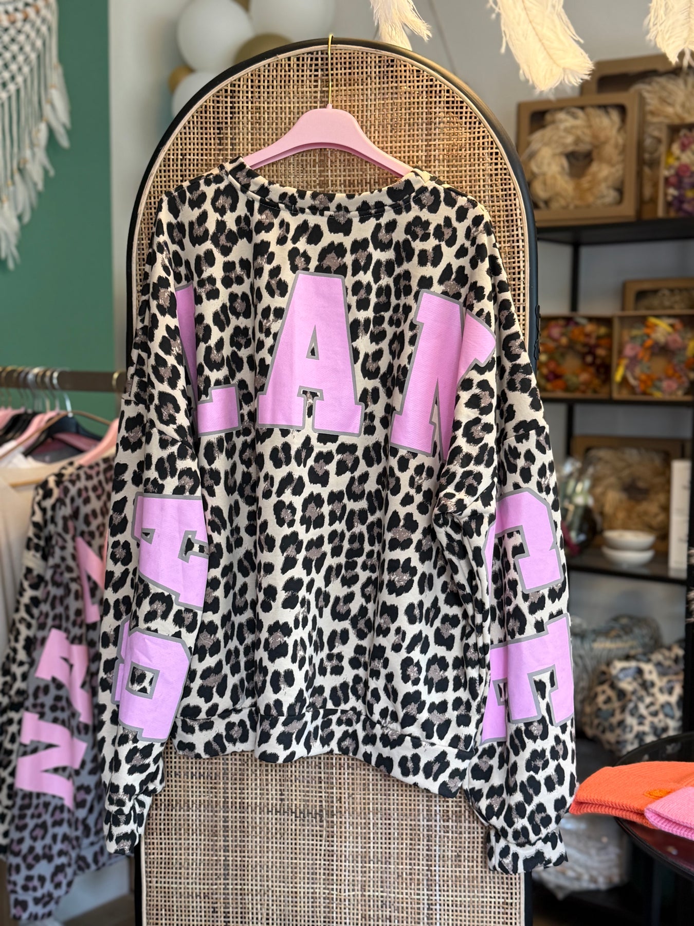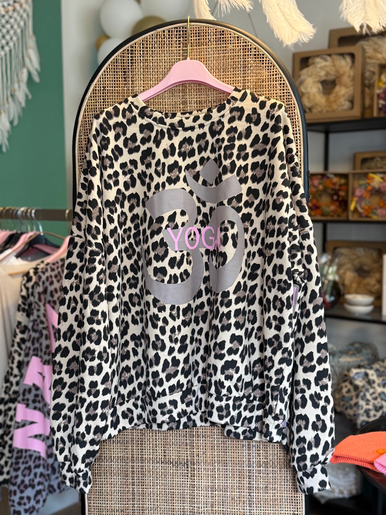 Yoga Pullover, Balance Pulli, Leo Print Pullover, rosa Schriftzug Shirt, Damen Pullover One-Size, Baumwolle Polyester Mix, Made in Italy, Statement Pullover, Boho Style, Wohlfühl Pullover